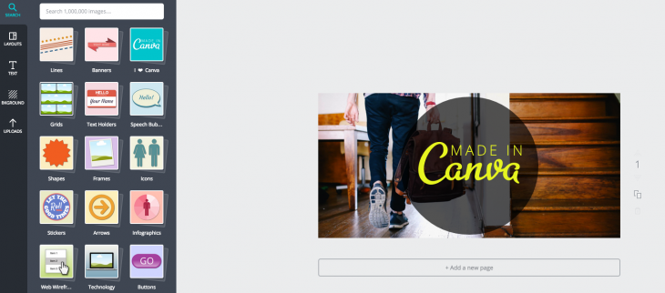Depending on what you’re creating, start by clicking on the Layouts tab and explore the different pre-made options. Alternatively, start with the Background tab if you’d like to use a pattern or photo (like I made above). Simply drag and drop on to the canvas. Once you do that, the world’s your oyster. Select any number of shapes, lines, banners, icons etc., it’s all there. Looking for something specific? Click on the Search bar! Still not finding what you want? Click the Uploads tab and add your own photos. It’s so easy to do.
