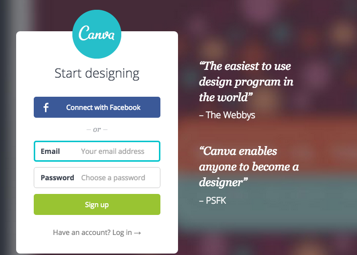 As I said, Canva is a free program to use, but you’ll need to sign up by either connecting your Facebook account or entering your e-mail address.